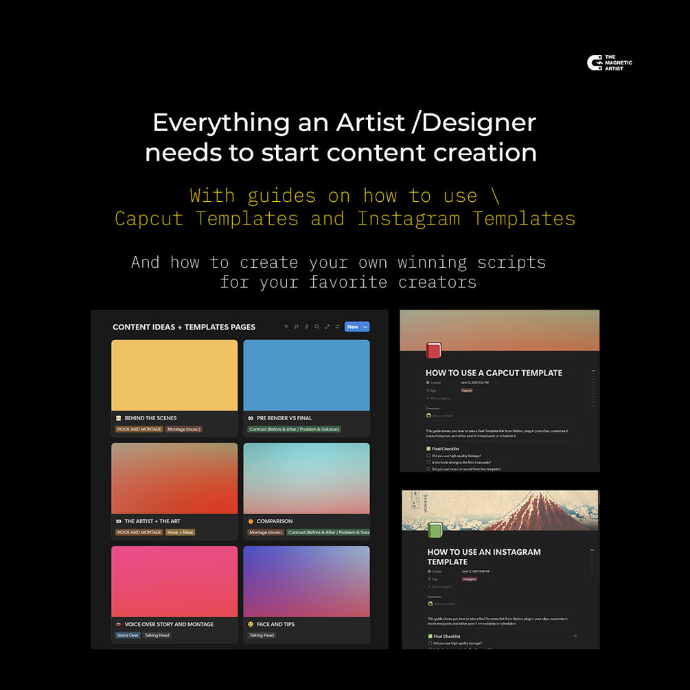 This Notion Guide includes clean and easy CapCut and Instagram templates, ideas, and examples from the top artist / content creators, with proven scripts and content to start being consistent on social media.